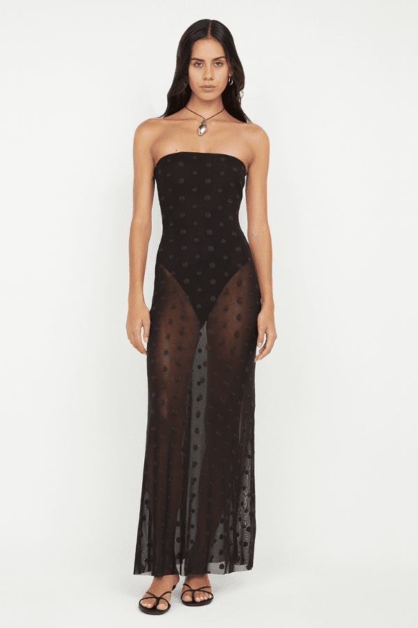 Introducing the Karla Strapless Maxi Dress in Black/Choc Spot.