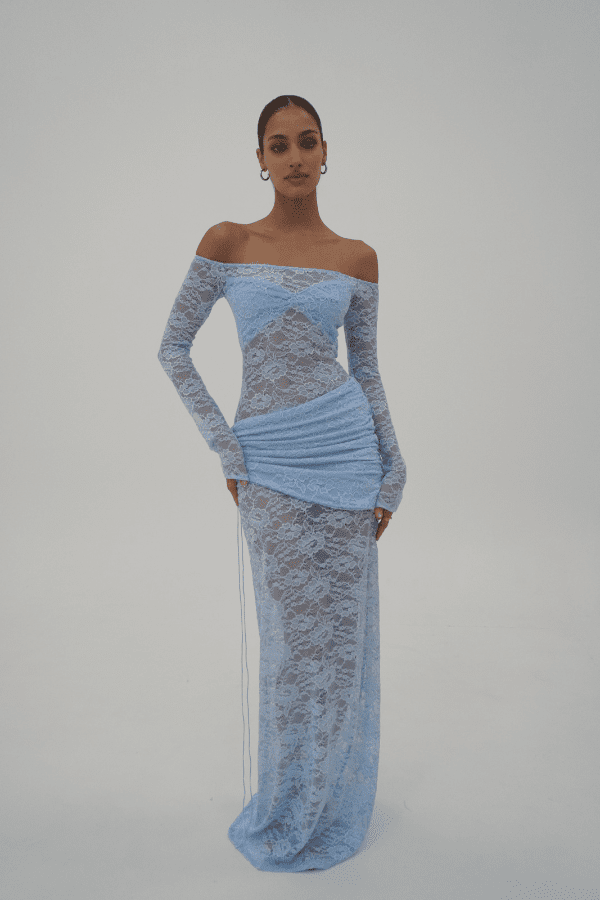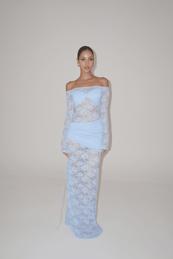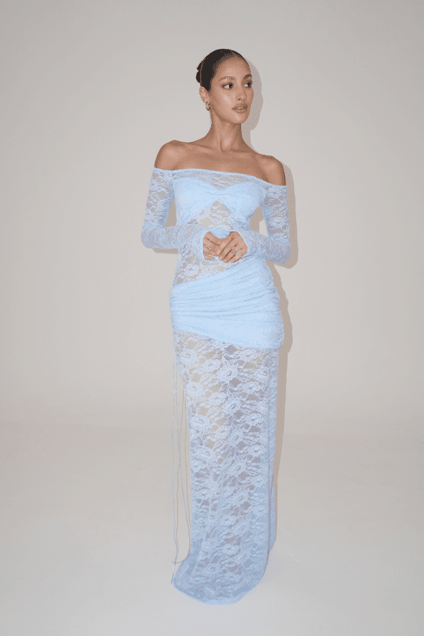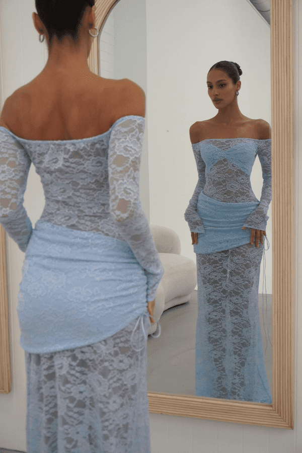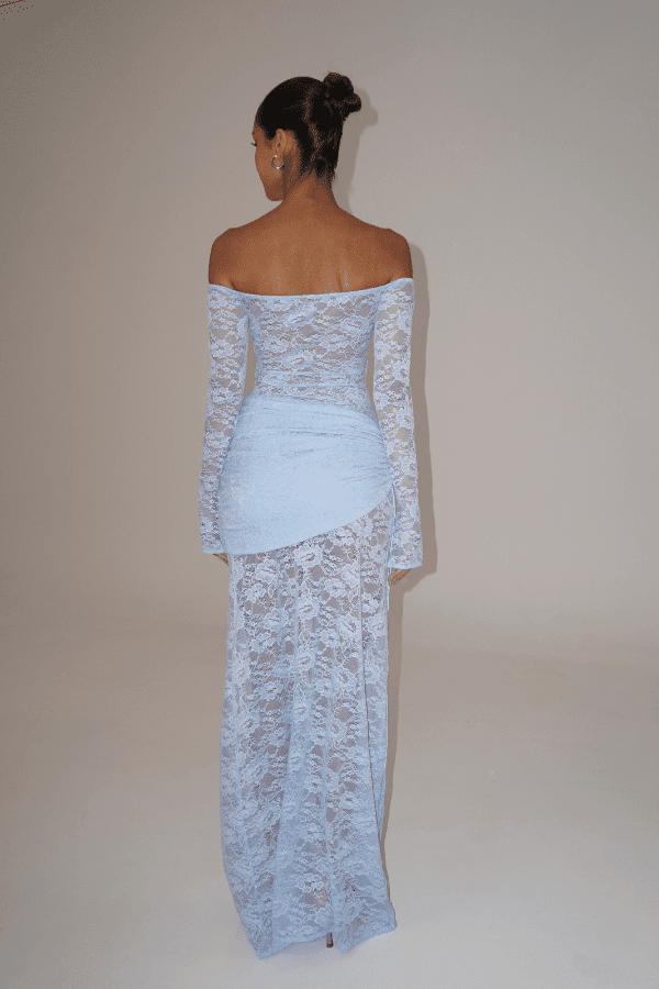 Introducing the Christiana in Powder Blue, a delicately crafted sheer lace dress that beautifully balances elegance and allure. Designed with strategically placed panels to flatter the bust and contour the silhouette, this piece includes a detachable overskirt for versatile styling. A seamless blend of Deconduarte¡¯s signature Carmine and Milano styles, the Christiana dress features a fully lace, backless design that makes a chic statement in any season.