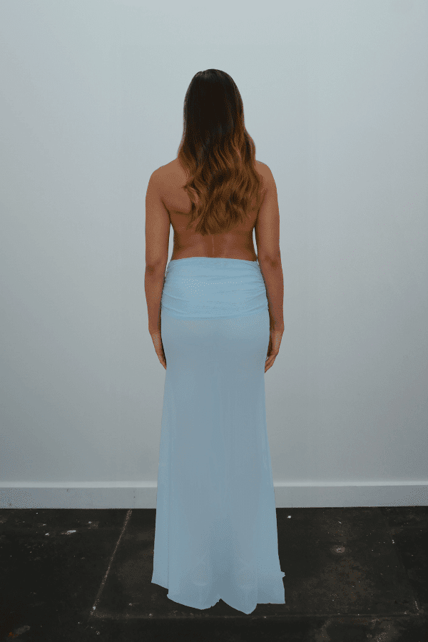 The Jade Dress in Light Blue blends ethereal elegance with sculptural detail. Crafted from sheer mesh, this halter-neck maxi features a fluid cowl neckline and flattering ruched waist that define the figure. A statement floral applique at the hip flows into cascading drapery, adding movement and drama. The sheer skirt elongates the silhouette, offering a graceful contrast to the structured accents.?