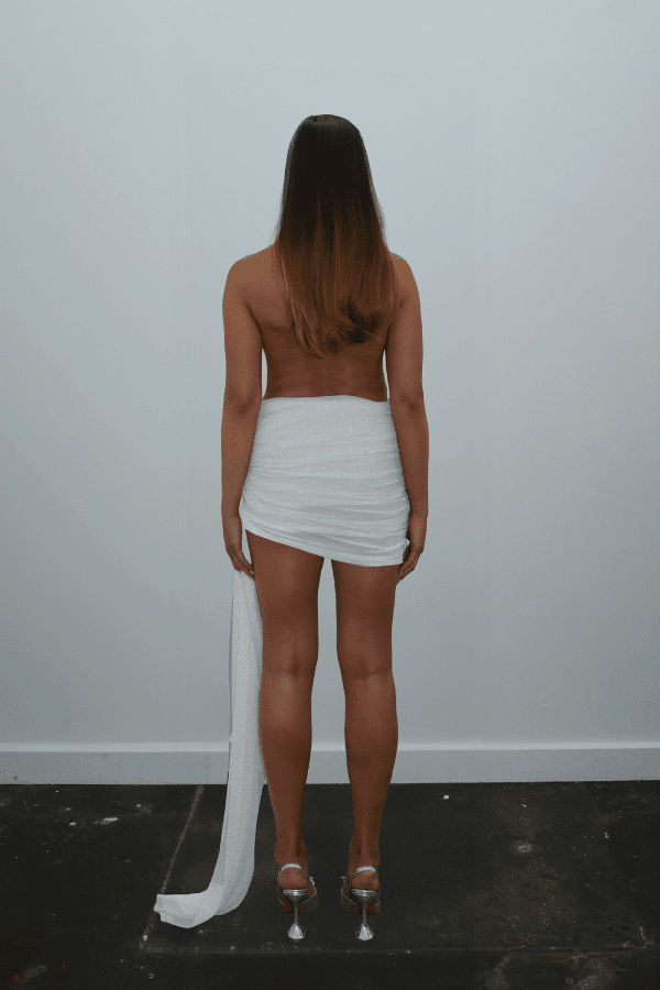 The Tiffany Dress in Baby Pink delivers bold glamour with a refined edge. Crafted from sheer mesh embellished with delicate rhinestones, this mini dress catches the light with every movement. A softly draped cowl neckline enhances the d¨¦colletage, while the ruched skirt contours the body for a flattering, feminine shape. The standout feature¡ªa flowing side train¡ªadds dramatic length and graceful movement, creating a show-stopping silhouette perfect for statement occasions.