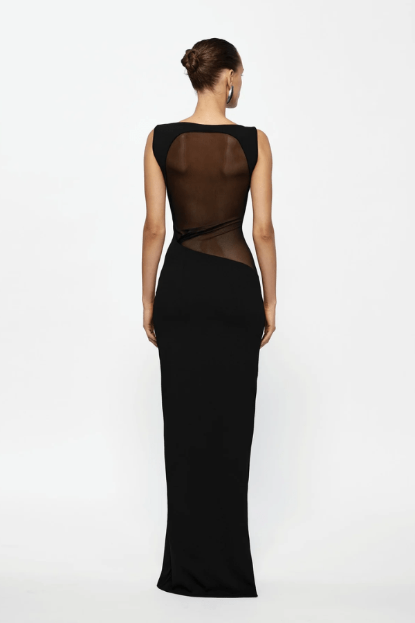 A harmonious blend of timeless elegance and modern allure, the Aisha Gown is designed to captivate. Sculpted from luxurious stretch crepe, it features a refined neckline and a daring mesh insert at the back¡ªdelivering a sophisticated yet seductive silhouette. The floor-length design effortlessly skims the body, offering a sleek finish ideal for formal occasions, romantic evenings, or elevated events.