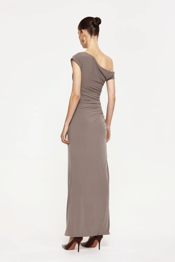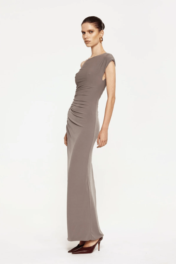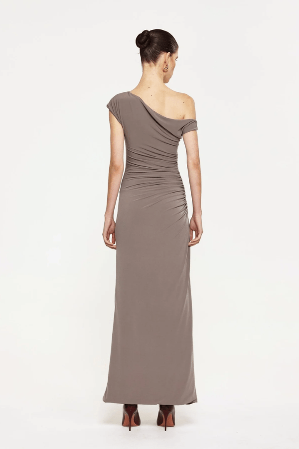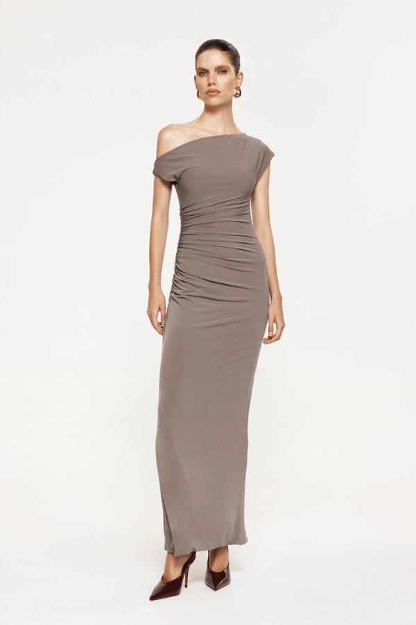 The Annabella Gown in Nutmeg is a timeless and versatile piece, perfect for any occasion. Designed with an elegant off-shoulder neckline, this gown features delicate ruching along the side, creating a beautifully soft and flattering silhouette. Crafted from Effie Kats' signature soft jersey fabric, it offers both comfort and sophistication.