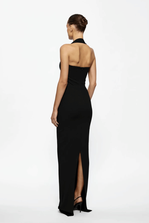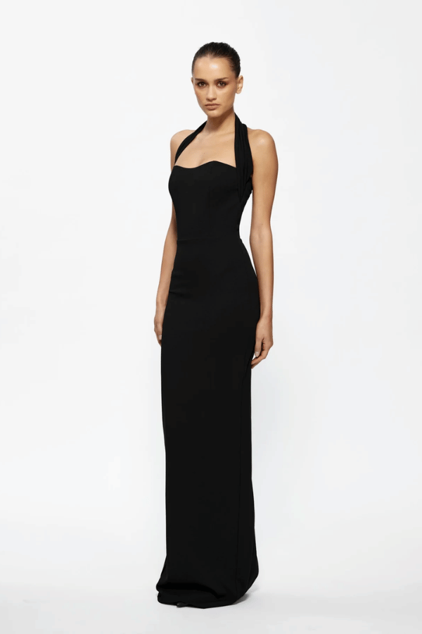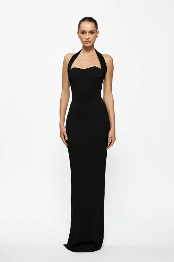 Introducing the Marian Gown¡ª a timeless silhouette designed for modern elegance. Crafted from stretch crepe that skims the body, this gown creates a flattering cinch at the waist. Featuring a classic halter bodice with a sweetheart neckline, it beautifully frames the d¨¦colletage. Cut at midi length, the Marian is perfect for year-round occasions.