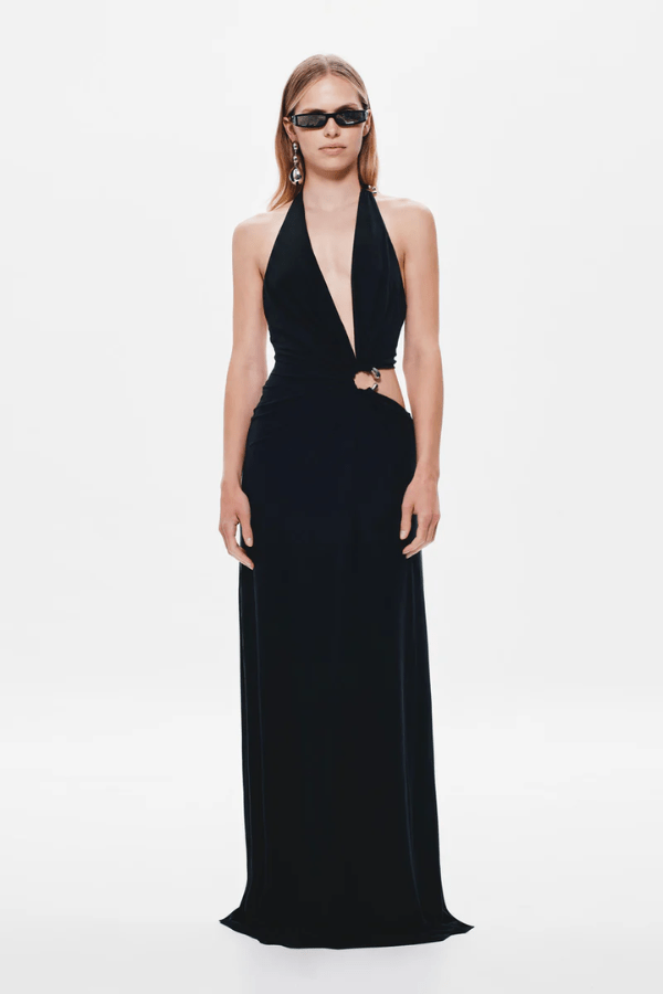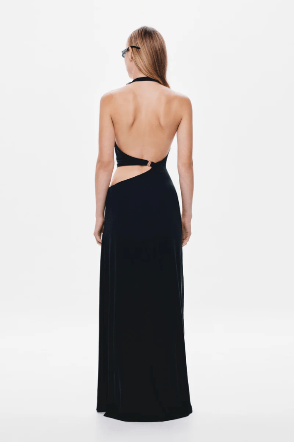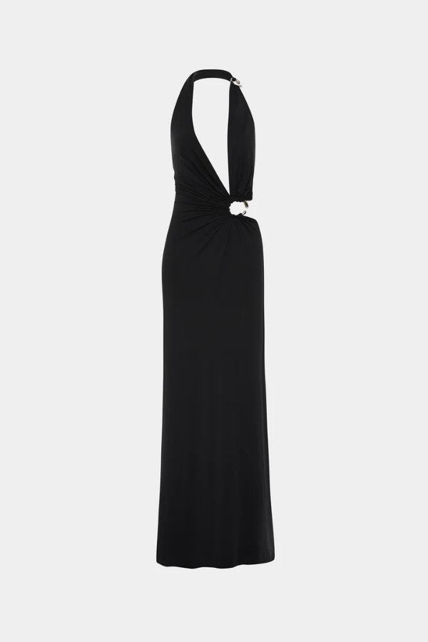 A sleek fusion of edge and elegance, the Devon Dress by Misha is crafted from a silky cupro blend that drapes the body with a luxe, fluid finish. Featuring an asymmetric plunge neckline and sculptural metal ring accents, this halter-neck silhouette flatters with delicate gathering and bold cut-outs at the midriff. An open back with a refined metal clasp completes the look, making this a standout piece for evening wear with a modern, daring twist.