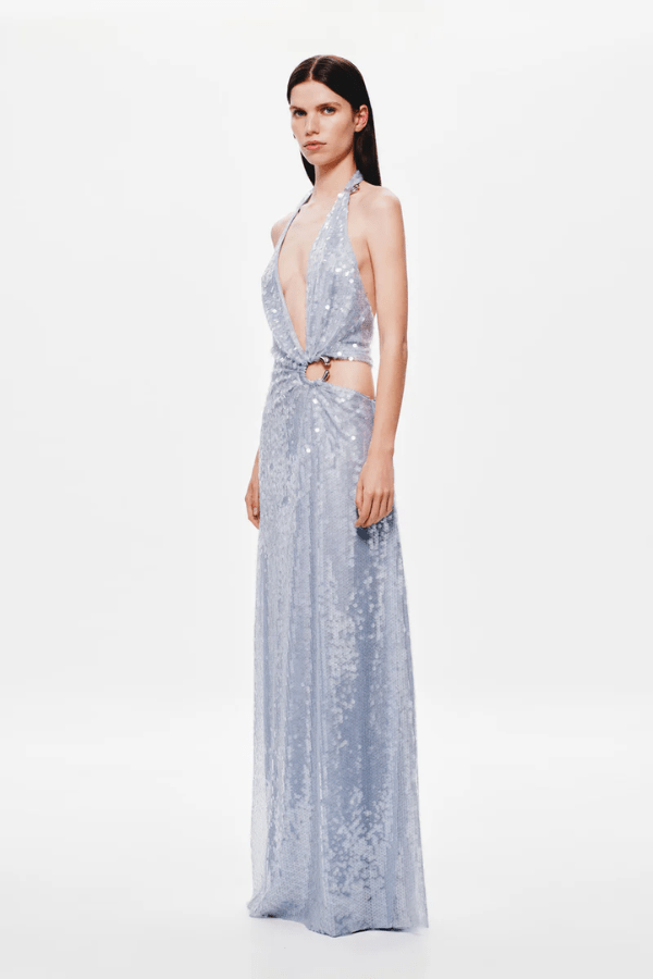Designed to captivate, the Devon Sequin Dress by Misha shimmers in a soft cloud blue hue with all-over sequins that catch the light from every angle. Featuring an asymmetric plunge neckline and a striking halter silhouette, this dress is elevated with metallic ring hardware at the neck and waist, creating soft gathers and sultry cut-outs. Finished with an open back and a refined ring closure, it¡¯s the ultimate statement piece for your next special event.