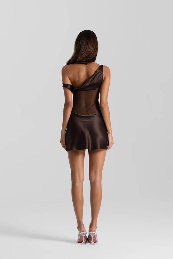 Defined by signature silk draping and her sculpted sheer contrast, Elodie is a mini dress for the contemporary minded.