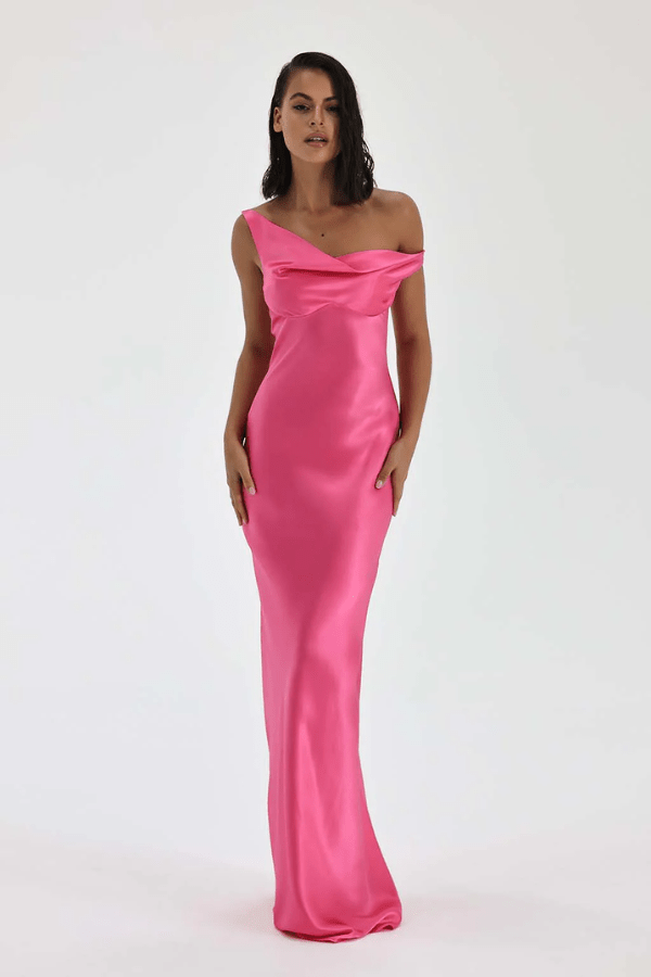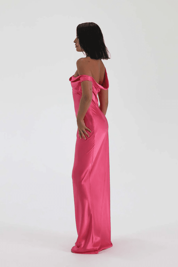 Introducing the Monika Gown in Neon Pink. This stunning silk gown features a luxurious bias cut, allowing the fabric to gracefully drape across the body. The asymmetrical neckline elegantly falls from the shoulder, while a fitted bust cup lining provides subtle support. Crafted from lightweight, breathable silk, the Monika Gown is the perfect statement piece for any special occasion.