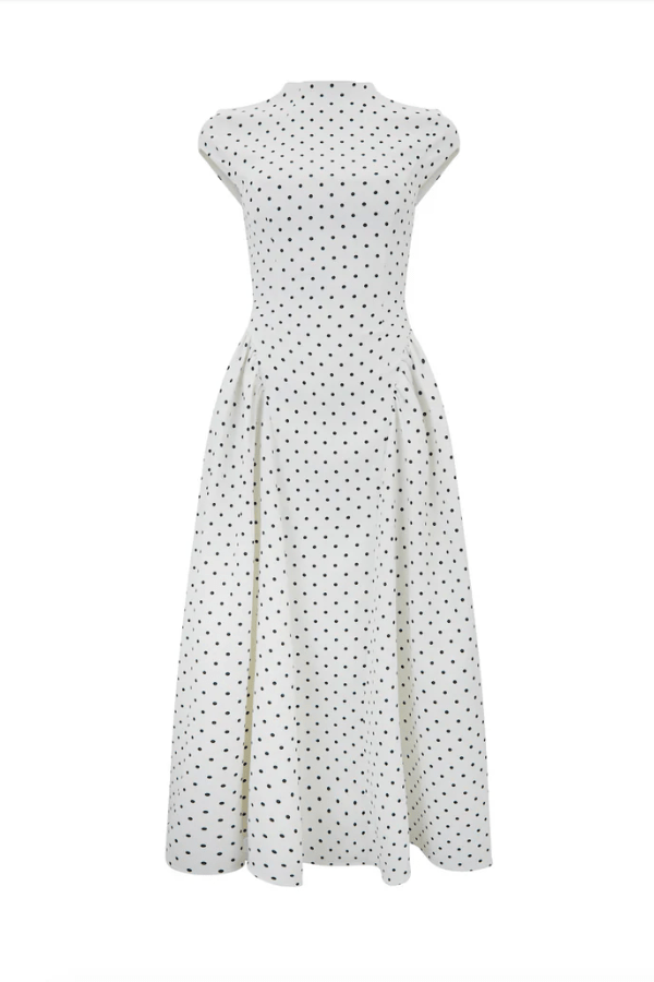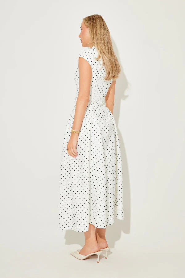 A timeless take on modern polish, this polka dot iteration of Odd Muse¡¯s iconic silhouette balances structure with softness. With its defined cap sleeves, darted bodice, and elegant side gathering, this midi dress shapes and flatters from every angle. The signature cinched waist and flowing hem make it a versatile favourite¡ªperfect for elevated daywear or effortless evening elegance.
