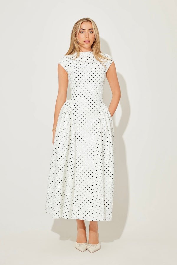 The Ultimate Muse Cap Sleeve Gathered Midi Dress Polka Dot