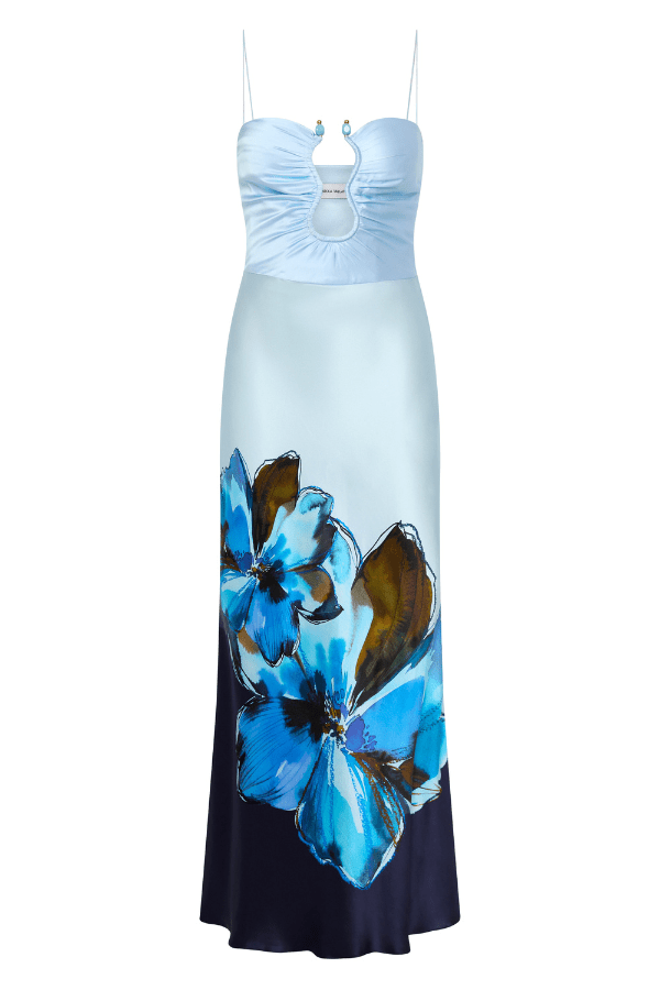 The Cyran Midi Dress captivates with its romantic floral print and refined silhouette. Crafted from 100% silk, it features a sweetheart neckline with a gold U-wire, delicate bead detailing, and slim spaghetti straps. A fitted bodice with playful cutouts enhances the feminine design, while full lining and a side zip ensure a seamless finish. Ideal for elegant soir¨¦es or summer events.