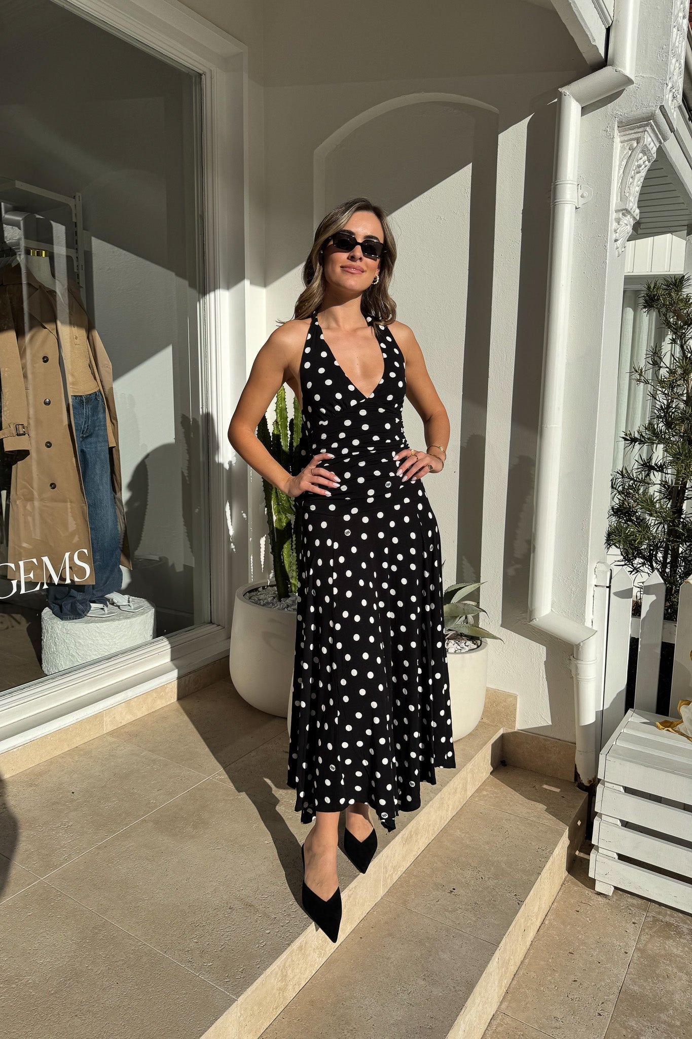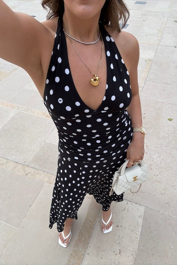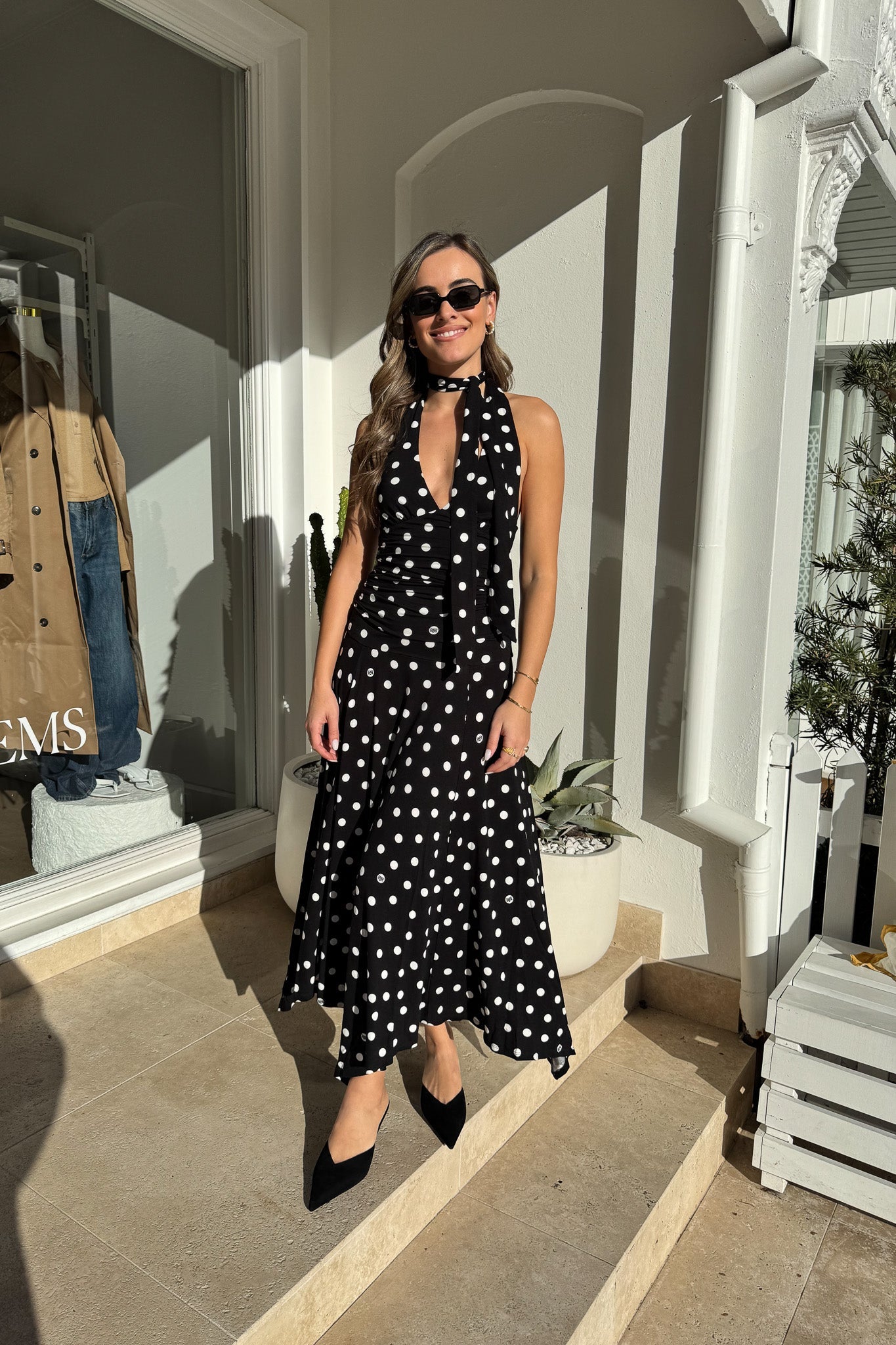 Effortlessly elegant, the Paris Midi Dress captures the spirit of romance in motion. Crafted from soft stretch jersey and adorned with our custom Sneaky Link polka dot, this dress features halter neck ties that double as a romantic scarf, subtle gathering through the waist, and a floaty handkerchief hem that adds movement and charm with every step. Perfect for long lunches and wandering the city streets.