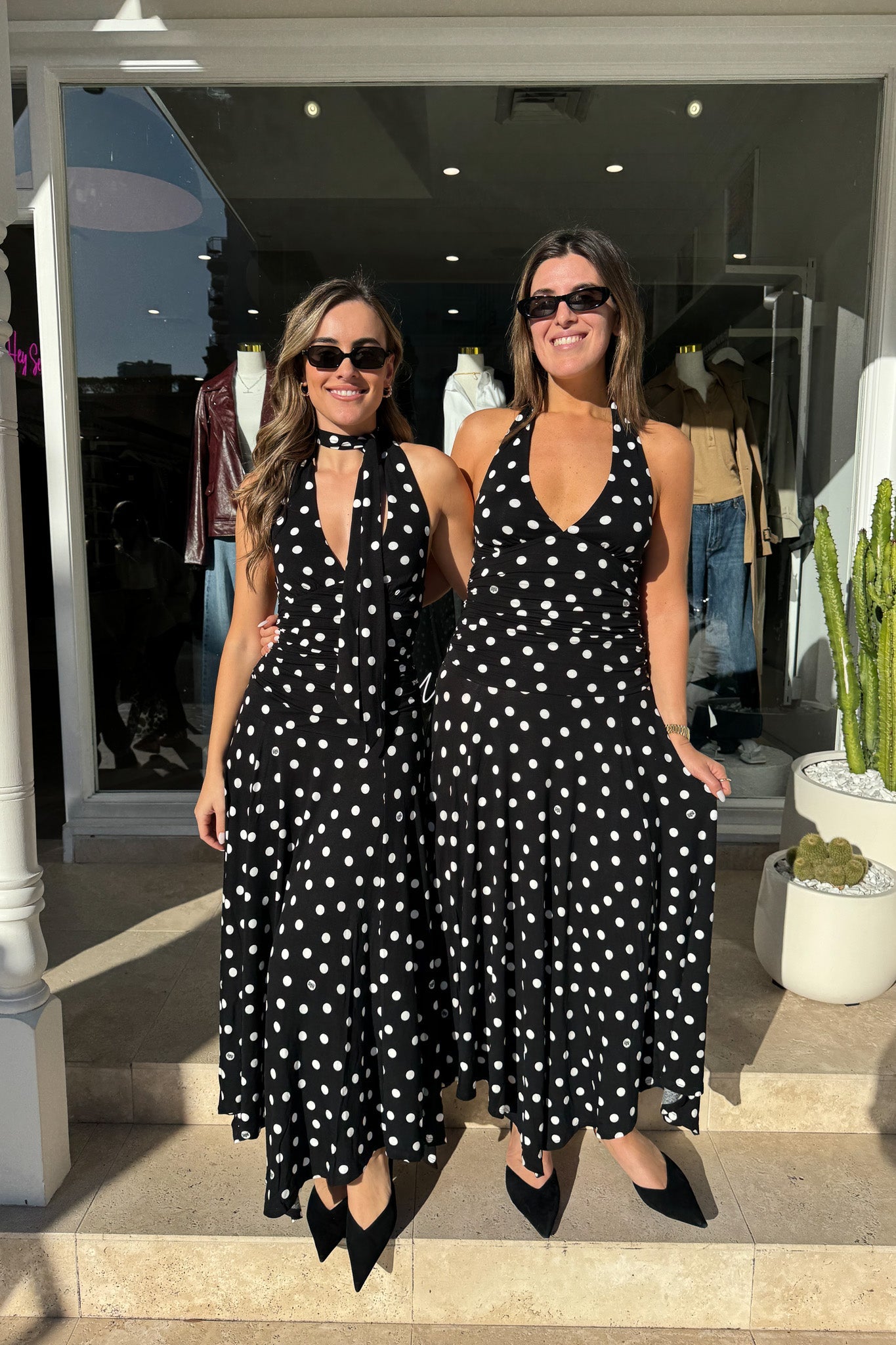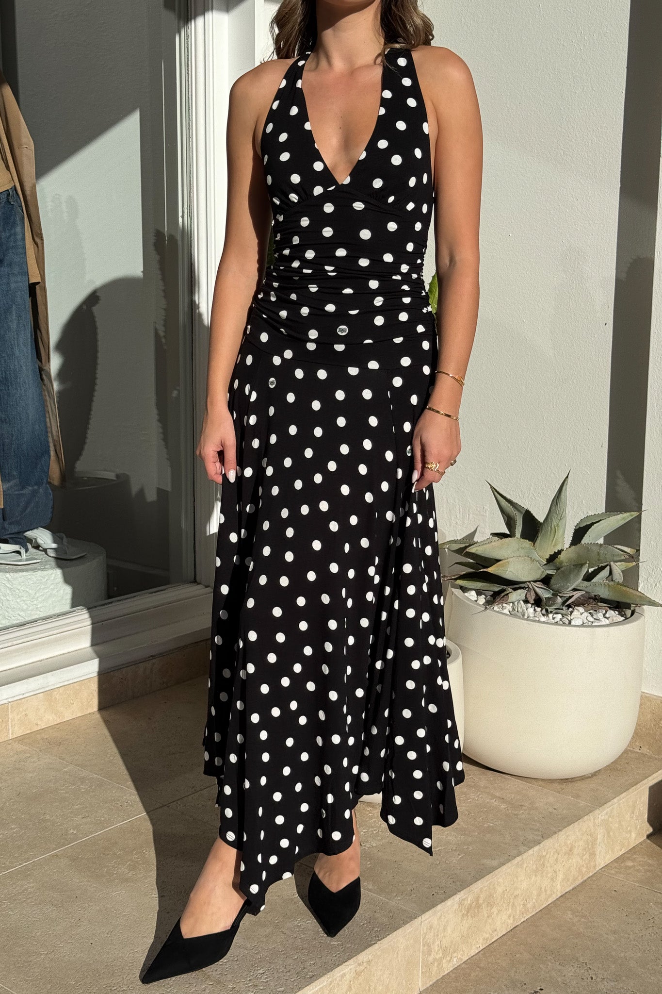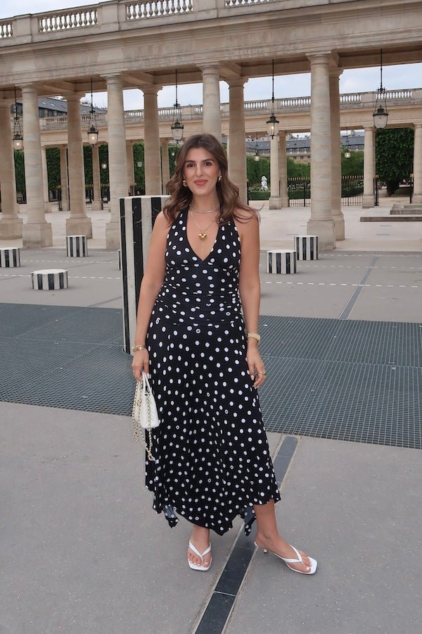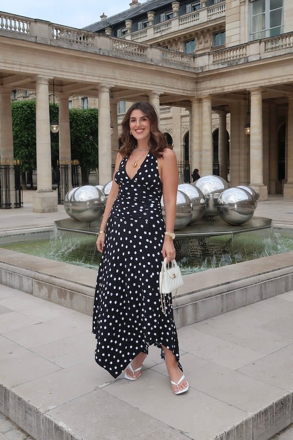 Effortlessly elegant, the Paris Midi Dress captures the spirit of romance in motion. Crafted from soft stretch jersey and adorned with our custom Sneaky Link polka dot, this dress features halter neck ties that double as a romantic scarf, subtle gathering through the waist, and a floaty handkerchief hem that adds movement and charm with every step. Perfect for long lunches and wandering the city streets.