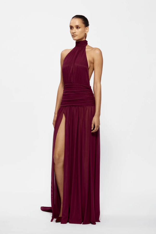astunning piece that perfectly blends sensual allure with vintage charm. Crafted from soft, buttery mesh, this gown gracefully flows and drapes across the body, beautifully highlighting the feminine form. The halter neckline seamlessly transitions into a full-length maxi skirt, while intricate ruching and texture along the bodice add depth and elegance. Featuring a breathtaking open-back design with a plunging train, the Verity Gown is made to be a timeless classic¡ªperfect for any occasion. Slightly sheer for an added touch of allure, this gown will remain a cherished staple for seasons to come.